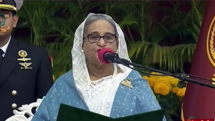 আর টানা চতুর্থবারের মতো রাষ্ট্র পরিচালনার দায়িত্ব নিল তার দল আওয়ামী লীগ। মন্ত্রিপরিষদ সচিব মো. মাহবুব হোসেন শপথ অনুষ্ঠান পরিচালনা করেন।