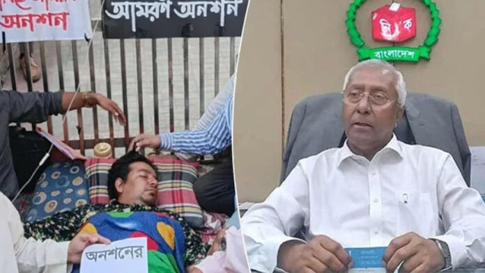 রোববার (৯ নভেম্বর) রাজধানীর আগারগাঁওয়ে নির্বাচন ভবনের সামনে দেখা যায়, মাটিতে বিছানো চাদরে স্যালাইন হাতে শুয়ে আছেন তারেক রহমান। দুর্বল কণ্ঠে কথা বলতে কষ্ট হচ্ছে তার। অনশনের জায়গাজুড়ে